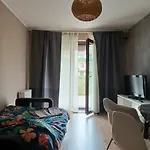 Apartament Apartament Maestro Z Tarasem I Garazem Wrocław o powierzchni 50 m^2 z widokiem na ogród położony jest w dzielnicy Krzyki, około 15 min jazdy samochodem od Wrocławskiego Parku Wodnego S.A. W trosce o wygodę gości zapewniono Wi-Fi oraz bezpłatny prywatny parking.